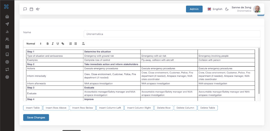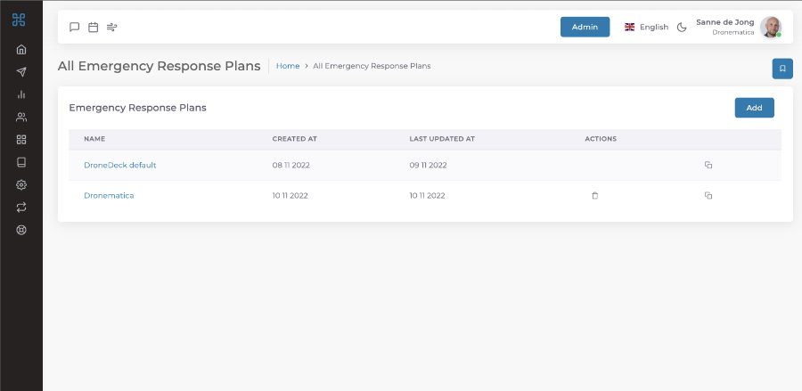 From now on you can create custom Emergency Response Plans in stead of using the default version in DroneDeck. On the Configuration > Emergency Response Plans page you can copy the default version as a starting point. By adding or deleting rows and colums you can create you custom ERP.