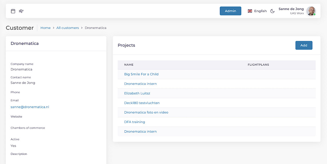 Houd het overzicht tussen de verschillende vliegplannen door deze toe te wijzen aan klanten en projecten. Een klant kan 1 of meerdere projecten hebben en onder een project kunnen 1 of meerdere vliegplannen vallen.