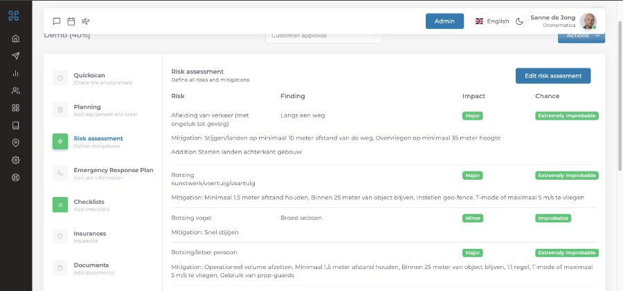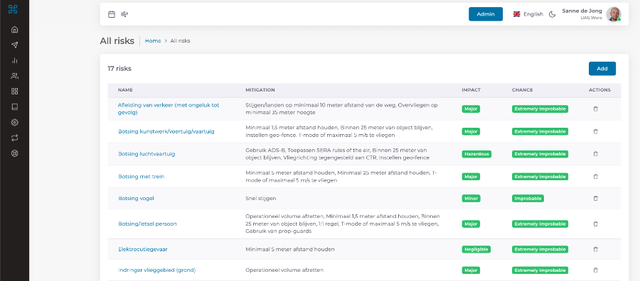 Definieer dezelfde risico's als u in uw Operationele Autorisatie heeft beschreven. De risico's worden gebruikt in uw vliegplan en hebben mitigaties om ervoor te zorgen dat uw vliegplanvoorbereiding resulteert in een veilige vlucht.